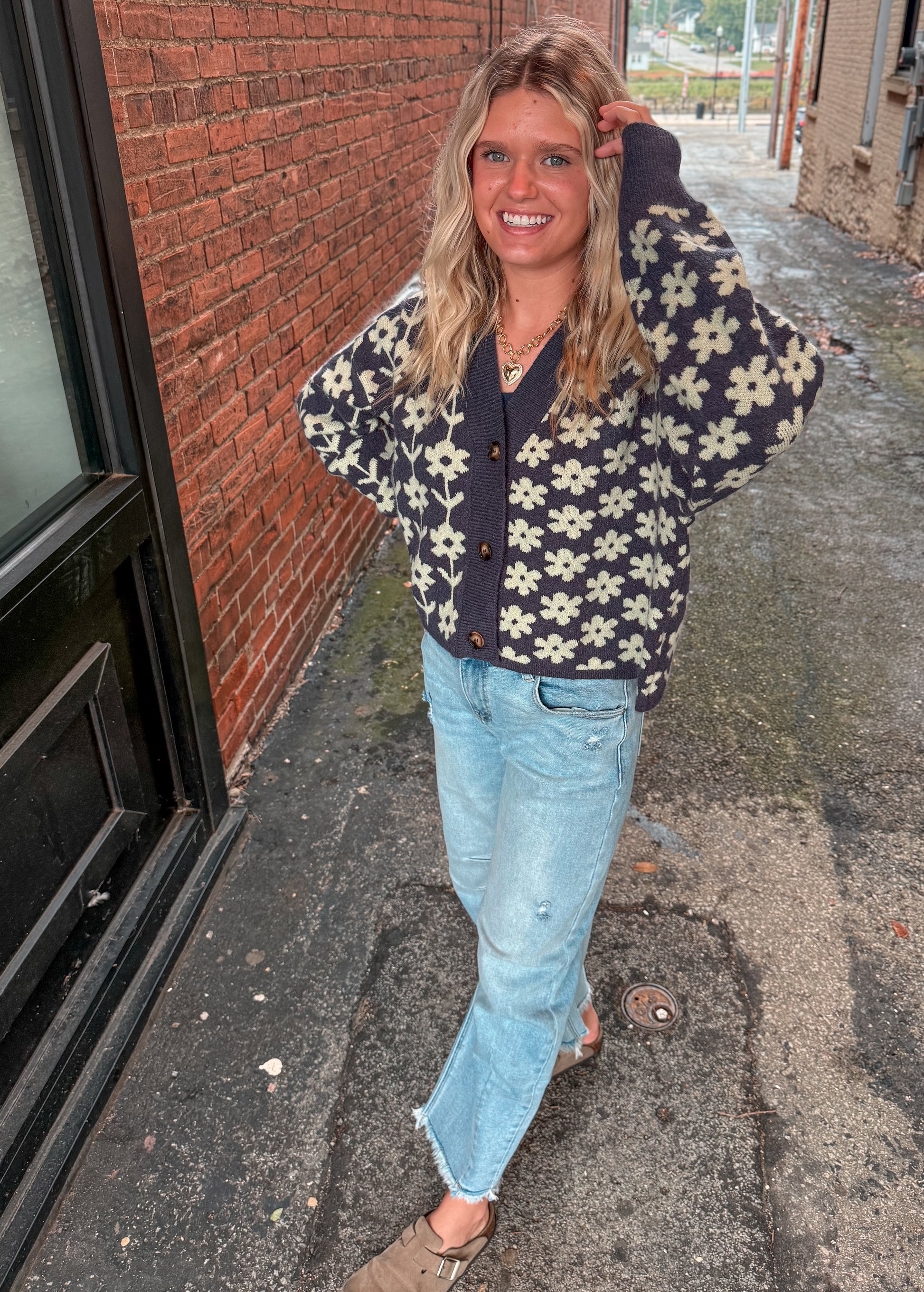 A flattering v-neckline, button-forn closre. Ribbed cuffs and hem add a touch of structure, while the slightly cropped length makes it perfect for pairing s high-waisted jeans or shorts. Whether your're layering up for chilly days or adding flair to a casual look. This cardigan brings a playful yet polished vibe to any outfit.