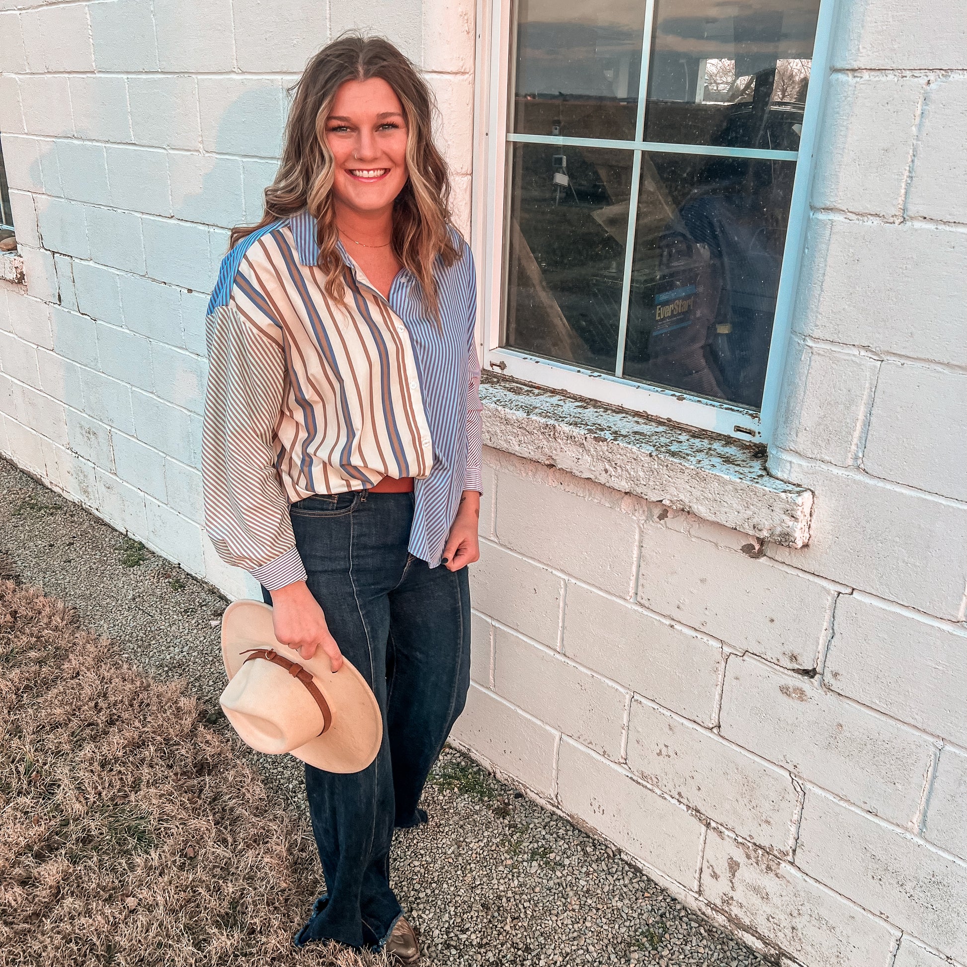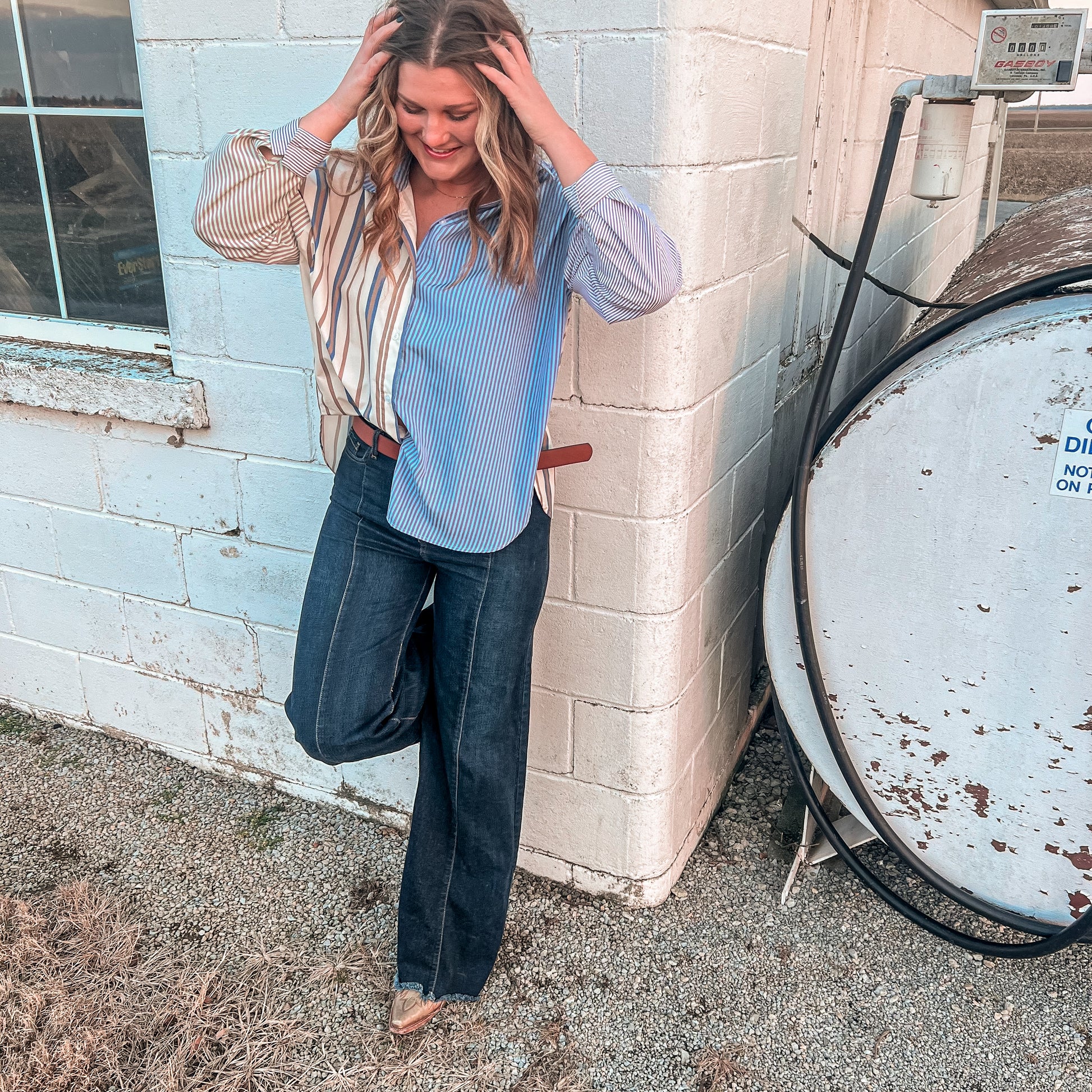 Stripe mix button down with a collard neckline. We are loving the blue and lilac color combinations on this top.