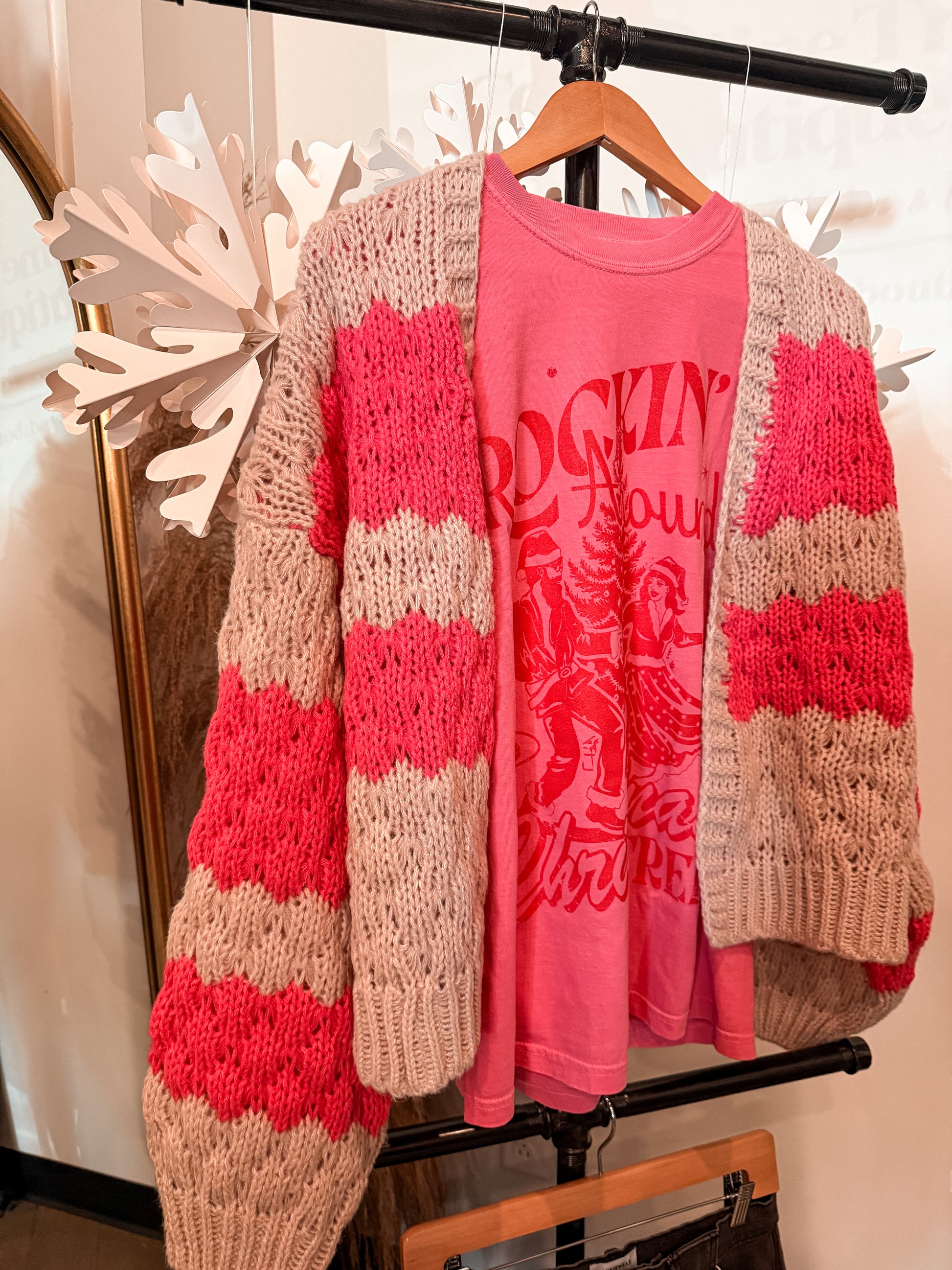 Cute, adorable, and festive. Rock around this year’s Christmas tree with this fun little pink graphic. Style with your favorite cardigan or our punchy pink cardigan this holiday season for all the festivities.